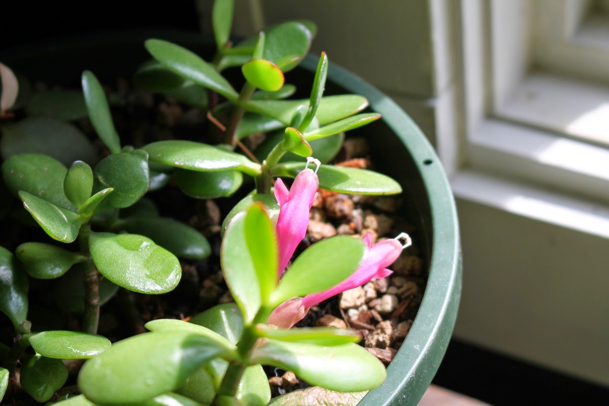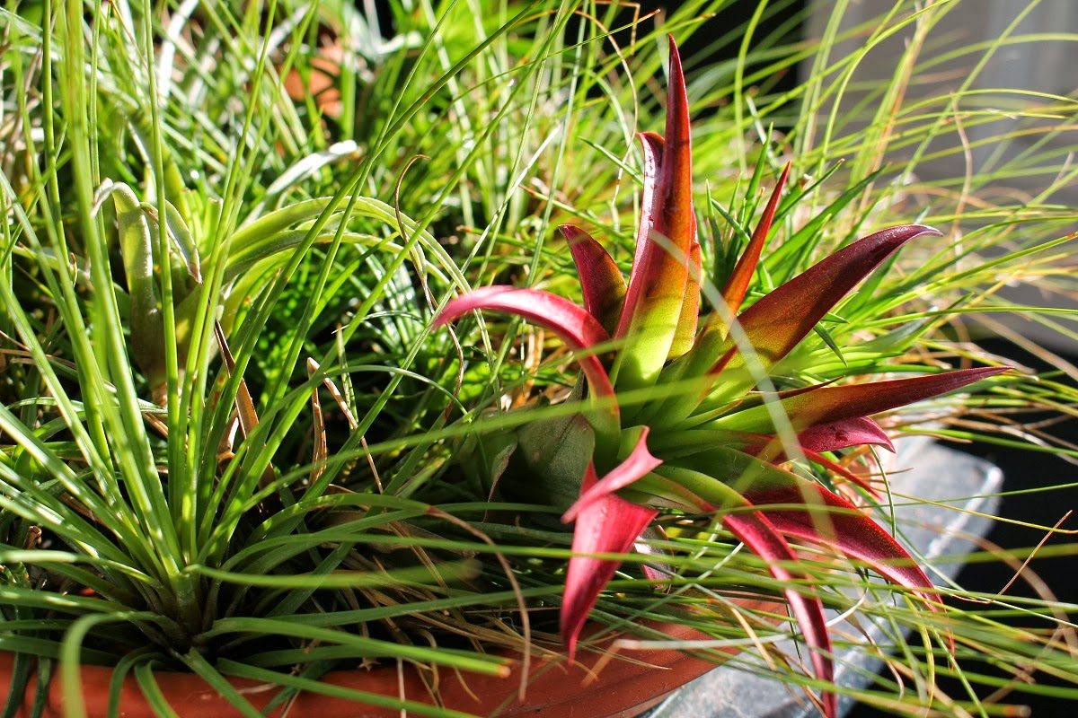All of the smallest cuttings bit the dust over those 5-6 months (!!!) and I potted up the rest in the urn this spring. The little guy on the left didn't make it, the leafy one in front is doing well, and the other two lost any leaves they have but have resprouted since... so there's still hope for them.