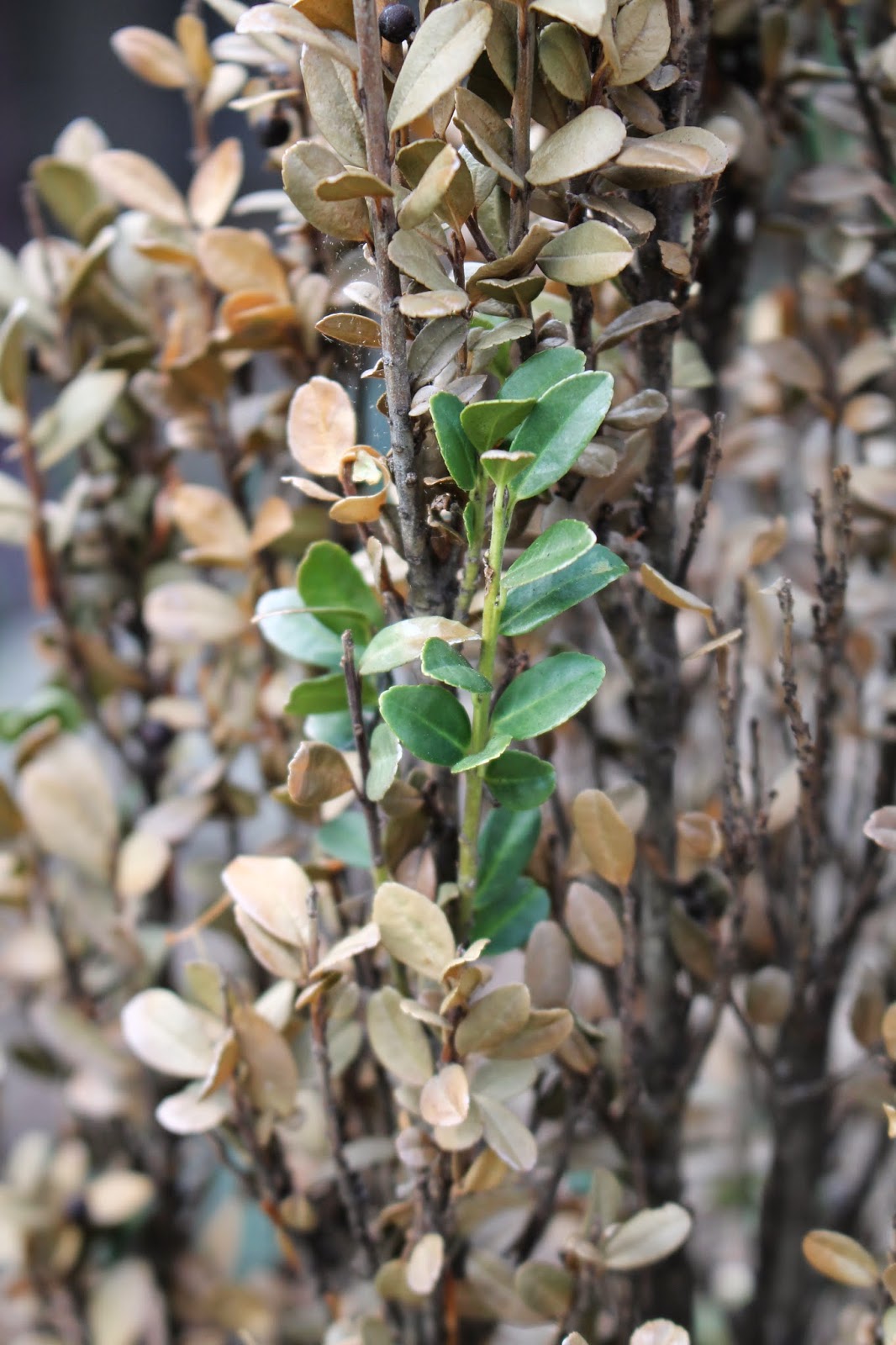 One plant I'm REALLY not sure about is my 'Sky Pencil' Japanese holly. It actually looked okay for most of the winter, but come early spring, the leaves started to turn brown: