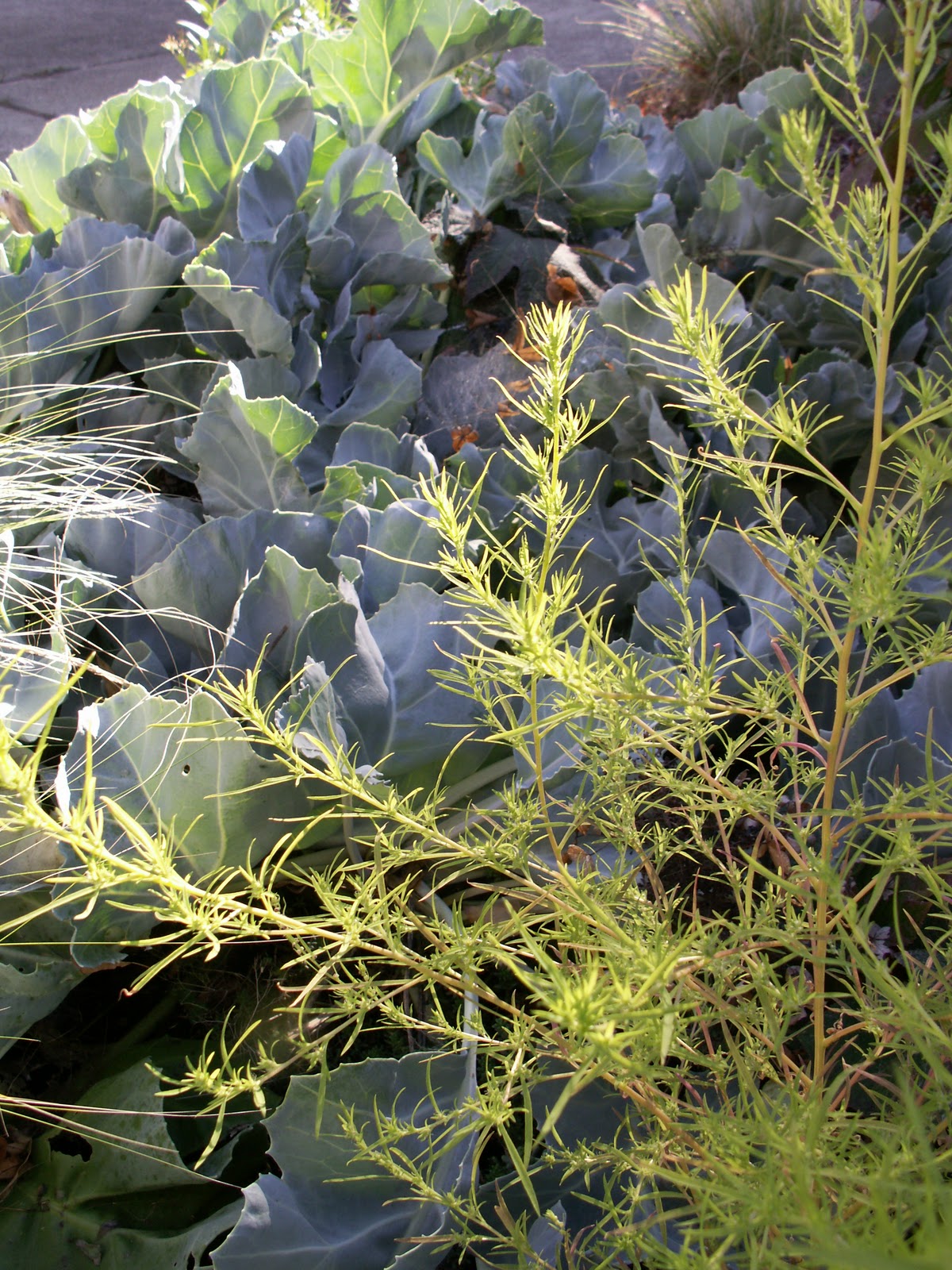 But the main evening sun show is in the front yard, in the very topmost corner where the driveway meets the sidewalk up to the front porch. Here is where chunky, undulating sea kale leaves burn a warm bright green AND a cool light blue: