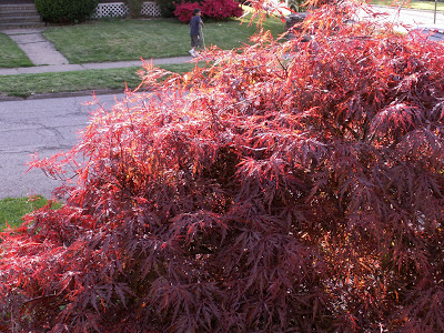 From top to bottom, you see a clump of NOID crimson tulips in my front yard, one of the dozen or so 'Black Hero' tulips that wave in the wind (hence the blurry pic) above my lamium and carex bed, my deep red (newly planted) ivy geraniums, and the dangling bells of a fuchsia hanging basket.